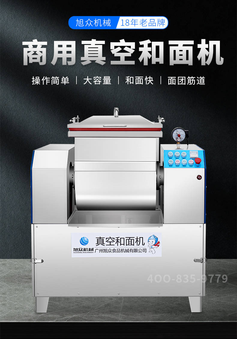 XZZK-25真空和面机,商用真空和面机,操作简单、大容量、和面快、面团筋道。在真空状态下模拟手工和面的原理,和面过程在真空负压下拌和,使面粉中的蛋白质在短时间内、充分的吸收水分,使面筋网络快速形成。