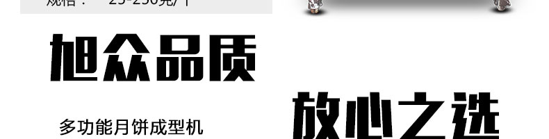 名称SZ-64月饼自动成型机 电源220V 功率0.4kw 产量40-60个/分钟 尺寸1760*530*1045mm 重量200kg 规格25-250克/个 其他
